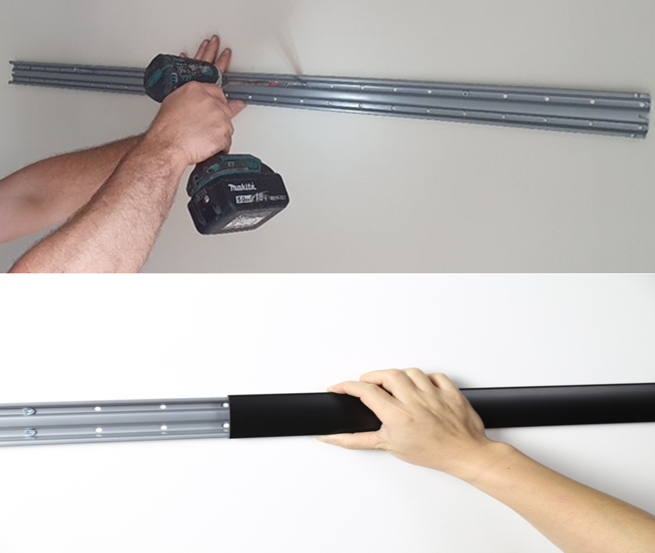 Select the desired length and quantity of tracks for your space. Seamlessly join and layer tracks to achieve full wall coverage. Crafted from high-strength steel and aluminum, installation is effortless, anchoring securely to Brick, Concrete, or Timber Wall Studs. Once installed correctly, our system can support up to 300kg per metre.